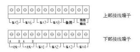 如下圖所示的接線端子排,按面板上的接線銘牌所示,在“總線”處接入通訊線,A為正(+)、B為負(fù)(-),根據(jù)不同功能的電氣火災(zāi)監(jiān)控探測器( L剩余電流式、W 測溫式),在輸入1、2、3、4、5、6、7、8處分別接入 1-8 路剩余電流互感器或溫度傳感器(不分極性)。
